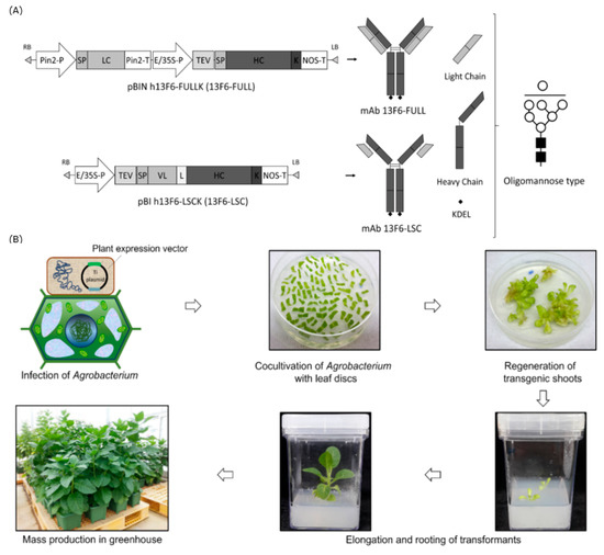 Schematic representation of the plant expression cassette and Agrobacterium-mediated plant transformation for the production of transgenic plants expressing 13F6 antibodies. (A) Plant expression cassettes of monoclonal antibody (mAb) 13F6-FULL and mAb 13F6-large single-chain (LSC) in plant expression vectors for plant transformation with expected protein and glycan structures. Key: Pin2-P, promoter of potato Pin2 gene; SP, signal peptide of ER; Pin2-T, terminator of potato Pin2 gene; cDNA of the light chain (LC) and heavy chain(HC) of the mAb 13F6 in Figure 1A, respectively; E/35S-P, enhanced duplicated 35S promoter of Cauliflower mosaic virus; TEV, untranslated leader sequence of RNA4 of an Alfalfa mosaic virus; K, KDEL endoplasmic reticulum (ER) retention motif; NOS-T, terminator of nopaline synthase (NOS) gene; VL, variable region of LC of mAb 13F6; L, peptide linker. Expected protein structures of mAb 13F6-FULL and mAb 13F6-LSC. The symbols of the glycan structures are as follows: GlcNAc, black square; mannose, white circle. (B) Schematic diagram of Agrobacterium-mediated transformation to generate transgenic plant and mass production of transgenic plants expressing the 13F6 antibodies. A. tumefaciens strain LBA4404 carrying the plant binary vector was used for plant transformation. Agrobacterium was inoculated into the wounded plant leaf slices. Agrobacterium-inoculated leaf-slices were regenerated in 3–4 weeks. A few weeks later, small shoots were formed from the callus. These small shoots were transferred to the in vitro plant culture box. For biomass production, the in vitro transgenic plants were transferred into the soil pot and grown in a greenhouse.
