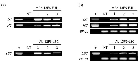PCR and RT-PCR analyses of transgenic LC, HC, and LSC in gDNA and mRNA of the transgenic plant expressing mAbs 13F6-FULL and 13F6-LSC. (A) PCR analysis was performed to confirm the existence of LC and HC of mAb 13F6-FULL and LSC of mAb 13F6-LSC gene construct in the plant transformants. (B) RT-PCR analysis was conducted to confirm the mRNA transcription of LC and HC of mAb 13F6-FULL and LSC of mAb 13F6-LSC gene construct in the plant transformants. The relative transcription level of each gene was normalized by using the EF-1α gene as the internal control. +: positive control, pBIN 13F6-FULL and pBI 13F6-LSC in DH5α; NT: negative control, non-transgenic N. tabacum plant; 1–3: transgenic line #. The volume of sample loaded was 10 μL for each sample.