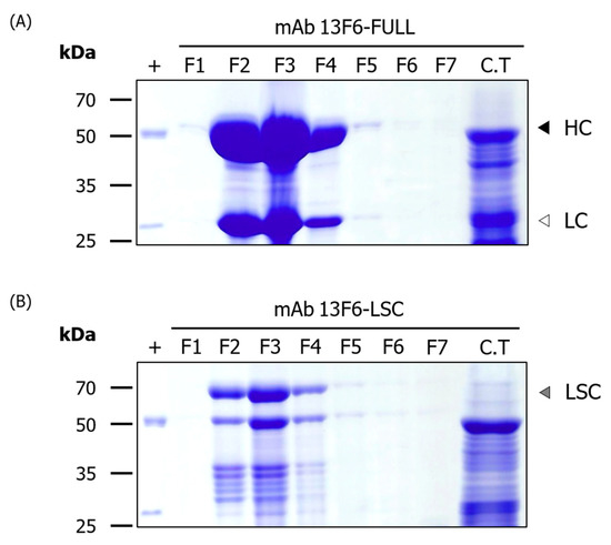 SDS-PAGE analysis to confirm the purification of mAb 13F6-FULL and mAb 13F6-LSC from transgenic N. tabacum plant. The eluted fractions of the purified mAb 13F6-FULL and mAb 13F6-LSC were visualized by Coomassie brilliant blue staining. Numbers on the left indicate molecular weight (kDa). +, commercial mAb 13F6 (mAb 13F6-C) as a positive control; F1–F7, purified samples from transgenic plants expressing mAb 13F6-FULL (A) and mAb 13F6-LSC (B); C.T, column through. Each well had 20 μL of the sample loaded in it. Black, white, and gray arrow heads indicate HC, LC, and LSC protein bands, respectively.