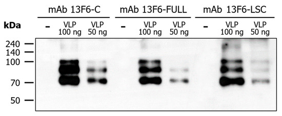 Detection of Ebola EBOV-like particles (VLPs) by mAb 13F6-FULL and mAb 13F6-LSC. Immunoblot analysis was performed to confirm the binding of mAbs 13F6 to VLPs. The VLPs were detected by mAb 13F6-C, mAb 13F6-FULL, or mAb 13F6-LSC and horseradish peroxidase (HRP)-conjugated goat anti-human IgG HC fragment specific antibody. Numbers on the left indicate molecular weight (kDa). −: negative control, 1× PBS; VLP: Ebola VLP; mAb 13F6-C, commercial 13F6 antibody as a positive control.