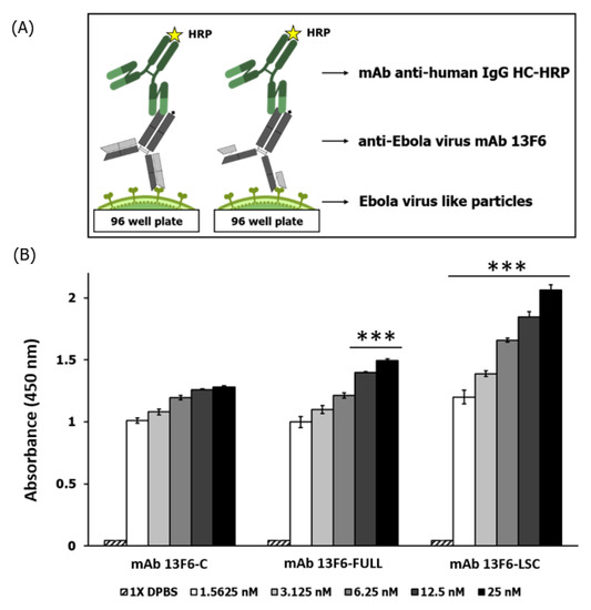 The 96-well MaxiSorp Nunc-immuno plates (Sigma-Aldrich, St. Louis, MO, USA) were coated with 1 µg per well of Ebola VLPs diluted in 1× DPBS (Welgene, Gyeongsan, Korea) and incubated overnight at 4 °C. The plates were washed with 200 μL of 1× DPBS plus 0.05% (v/v) Tween 20 (1× DPBS-T) per well for four times and blocked with 3% BSA (bioWORLD, Dublin, OH, USA) in 1× DPBS-T for 2 h at RT. After washing, 1.5625 ng to 25 ng of the mAb 13F6-FULL, mAb 13F6-LSC, and the commercial anti-ZEBOV GP mAb 13F6 (IBT BioServices, Rockville, MD, USA) were incubated in 1X DPBS-T for 2 h at 37 °C as the primary antibody. After washing, the plates were treated with peroxidase-conjugated AffiniPure goat anti-human IgG, Fcγ fragment specific antibody (dilution of 1:4000) and incubated for 2 h at RT. After another wash with 1× DPBS-T, the ELISA plates were detected using 100 μL per well of the SureBlue TMB Microwell Peroxidase Substrate and the TMB stop solution (SeraCare, Milford, CT, USA). The absorbance was measured at 450 nm using an Epoch microplate spectrophotometer (BioTek, Winooski, VT, USA).