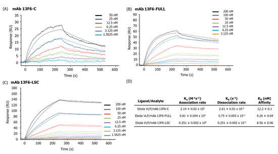 The binding affinity of mAb 13F6-C, mAb 13F6-FULL, and mAb 13F6-LSC to the Ebola VLP was measured using SPR (Figure 8). The Ebola VLP was immobilized onto a PEG sensor chip and a series of different concentrations of mAb 13F6-FULL, mAb 13F6-LSC, and the commercial anti-ZEBOV GP mAb 13F6 (mAb 13F6-C as a positive control) were applied and the binding kinetics examined. The association and dissociation rates for mAb 13F6-C were 2.14 ± 0.02 × 105 M−1s−1 and 2.61 ± 0.01 × 10−3 s−1, respectively (Figure 8A,D). The binding affinity (KD) was calculated as 12.2 ± 0.1 nM (Figure 8D). The association and dissociation rates for mAb 13F6-FULL were 0.81 ± 0.004 × 105 M−1s−1 and 0.75 ± 0.005 × 10−3 s−1, respectively. The binding affinity (KD) was calculated as 9.26 ± 0.04 nM (Figure 8B,D). The association and dissociation rates for mAb 13F6-LSC were 0.251 ± 0.002 × 105 M−1s−1 and 0.251 ± 0.002 × 10−3 s−1, respectively (Figure 8C,D). The binding affinity (KD) was calculated as 8.56 ± 0.06 nM (Figure 8D). Therefore, the association and dissociation rates of mAb 13F6-FULL and mAb 13F6-LSC were lower than that of mAb 13F6-C.