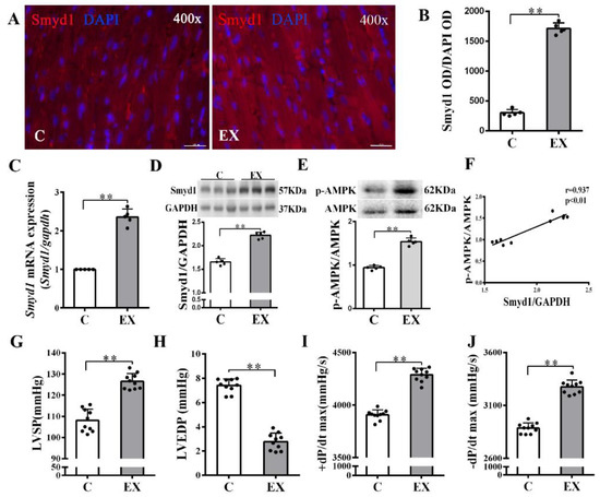 Effects of exercise training on cardiac expression of Smyd1 and cardiac function in healthy normal rats without myocardial infarction (MI): (A) representative immunofluorescence staining images of rat heart sections from the healthy control (C) and exercise (EX) groups. Smyd1 was stained in red fluorescence, and the nuclei were stained with DAPI (4′,6-diamidino-2-phenylindole) in blue color (scale bar = 100 µm); (B) Integrated optical density (IOD) of Smyd1 (as a ratio normalized with IOD of DAPI); (C,D) Smyd1 mRNA levels assessed with RT-qPCR (C) and Smyd1 protein expression assessed with Western blots (D) in the heart tissues; (E) ratio of phosphorylated AMP-activated protein kinase (p-AMPK) and total AMPK protein expression; (F) correlation analysis among Smyd1 expression and the ratio of p-AMPK/AMPK; and (G–J) effects of exercise training on cardiac function parameters. Data are expressed as mean ± Standard Deviation (SD), n = 5/group (B–E) or n = 10/group (F–J). Symbols indicate ** p < 0.01. Abbreviations: LVSP, left ventricular systolic pressure; LVEDP, left ventricular end-diastolic pressure; and ±dP/dtmax, the maximal rate of rise or decline of left ventricular pressure.