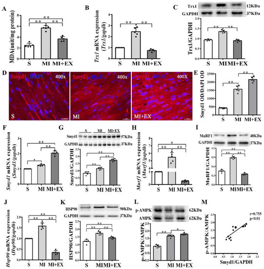 mRNA and protein expression of Smyd1 (SET and MYND domain containing 1), Trx1 (thioredoxin 1), MuRF1 (muscle RING-finger protein-1), and HSP90 (heat shock protein 90) and antioxidant capacity in the post-MI rat hearts: (A) Malondialdehyde (MDA) content in the infarcted myocardium; (B,C) mRNA level assessed by RT-qPCR (B) and protein level assessed by Western blot (C) of Trx1 in the infarcted myocardium; (D) immunofluorescent staining with Smyd1 (red color) and DAPI (blue color) in the sections from peri-infarcted area of heart (scale bar = 100 µm); (E) Integrated optical density (IOD) of Smyd1 (as a ratio normalized with IOD of DAPI); (F,G) Smyd1 mRNA levels assessed with RT-qPCR (F) and Smyd1 protein expression assessed with Western blots (G) in the heart; (H–K) mRNA assessed with RT-qPCR (H,J) and protein expression assessed with Western blots (I,K) of MuRF1 and HSP90 respectively in the heart tissues; (L) the ratio of phosphorylated AMPK (p-AMPK) and total AMPK protein expression; and (M) correlation analysis among Smyd1 expression and the ratio of p-AMPK/AMPK. Data are expressed as mean ± Standard Deviation (SD), n = 5/group (graphs A to L, except D) or n = 15/group (M). Symbols indicate * p < 0.05 and ** p < 0.01. Abbreviations: S, Sham group; MI, MI alone group; and MI + EX, post-MI exercise training group.