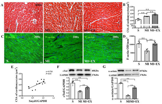 Cross-sectional areas (CSAs) of surviving cardiomyocytes in the peri-infarcted area were significantly enlarged in the MI group as compared with the S group (p < 0.01, Figure 3A,B). CSA further increased in the MI + EX group as compared with the MI group (p < 0.01, Figure 3A,B). These results suggested that MI triggered a compensatory hypertrophic response in the surviving cardiomyocytes, which was further enhanced by post-MI exercise training. Pearson correlation analysis revealed a significant positive correlation between CSA and Smyd1 expression (p < 0.01, n = 15, Figure 3E), suggesting a possible association of between cardiac Smyd1 expression and exercise-induced cardiomyocyte hypertrophy.