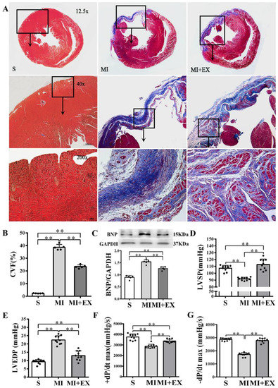 MI significantly increased the collagen volume fraction (CVF) level and BNP protein expression in the heart (p < 0.01 vs. the S group, Figure 4A–C) and resulted in LV dysfunction manifested as significantly declined LVSP and ±dP/dtmax and elevated LVEDP (p < 0.01 vs. the S group, Figure 4D–G). Post-MI exercise training reduced the CVF level (p < 0.01, Figure 4A,B) and downregulated BNP expression (p < 0.05 vs. the MI group, Figure 4C). The beneficial effects of exercise training were associated with improved LV function (p < 0.01, Figure 4D–G).