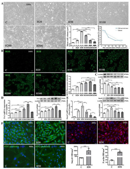 Effects of H2O2 on H9C2 cell size and Smyd1, Trx1, and F-actin expression: (A) cell morphology, volume, and survival rate following various concentrations of H2O2 in H9C2 cells (scale bar = 100 µm); (B) the level of intracellular reactive oxygen species (ROS) generation in H9C2 cells from control and H2O2 intervention groups was measured by 2′,7′-dichlorodihydrofluoresein diacetate (DCFH-DA) staining followed by quantification of fluorescence intensity; and (C–E) mRNA assessed with RT-qPCR and protein expression assessed with Western blots of α-actinin (C), Trx1 (D), and Smyd1 (E). Graph (F) shows immunofluorescence microscopy of cTnT (green color), Smyd1 (red color), and FITC-phalloidin (green color) in H9C2 cells, whereas the nuclei were stained by DAPI (blue color); scale bar = 200 µm. Data are expressed as mean ± Standard Deviation (SD), n = 5/group. Symbols indicate * p < 0.05 and ** p < 0.01. Abbreviations: C, Untreated control group and H20, H50, H100, H200, and H300, H9C2 cells treated with 20, 50, 100, 200, and 300 µmol/L H2O2, respectively.