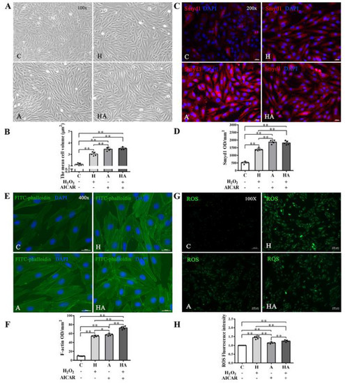 Effects of H2O2 and AMP-activated protein kinase (AMPK) agonist (AICAR) on cell volume, F-actin and reactive oxygen species (ROS) in H9C2 rat cardiomyoblasts in vitro: (A,B) cell morphology and volume of H2O2, AICAR, or H2O2 + AICAR-treated H9C2 rat cardiomyoblasts (scale bar = 100 µm); (C,D) immunofluorescence staining of Smyd1 (red color, graph C) and integrated optical density (IOD, graph D). The nuclei of cells were stained by DAPI (blue color), scale bar = 200 µm; (E,F) immunofluorescence staining of FITC-phalloidin (green color, graph E) and IOD in H9C2 cells (graph F, scale bar = 400 µm); (G) representative images showing ROS generation levels under various treatment conditions; and (H) quantified fluorescence intensity. Data are expressed as mean ± Standard Deviation (SD), n = 5/group. Symbols indicate * p < 0.05 and ** p < 0.01. Abbreviations: C, Untreated control group; H, H2O2-treated group; A, AICAR-treated group; and HA, H2O2 + AICAR cotreated group.