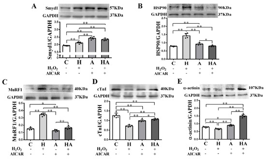 Effects of H2O2 and AICAR on expression of Smyd1 and cytoskeleton-associated proteins in H9C2 rat cardiomyoblasts in vitro: Western blot results of Smyd1 (A), HSP90 (B), MuRF1 (C), cTnI (D), and α-actinin (E) expressions in H9C2 cells. Data are expressed as mean ± Standard Deviation (SD), n = 5/group. Symbols indicate * p < 0.05 and ** p < 0.01. Abbreviations: C, Untreated control group; H, H2O2-treated group; A, AICAR-treated group; and HA, H2O2 + AICAR cotreated group.
