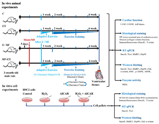 Furthermore, appropriately employed post-MI exercise training has been recommended for effective reduction of MI-associated complications and for improving cardiac function and physical activity rehabilitation in patients with MI [20]. Exercise intervention may stimulate angiogenesis in the ischemic heart, improve myocardial cell metabolism, and reduce oxidative injury caused by cardiac ischemia [21]. Exercise can also attenuate inflammation and limit scar thinning after MI [22]. Despite various modalities and mechanisms of exercise training having been studied in injured hearts [23,24,25], whether Smyd1 plays a role in cardioprotective effects of post-MI exercise training on oxidative stress and myocardial hypertrophy/remodeling in infarcted hearts remains elusive. Under this context, the purpose of our present study is to investigate the potential role of Smyd1 in post-MI ventricular remodeling and dysfunction and the potential benefits of post-MI exercise training by means of our established in vivo rat model of MI. Additional series of in vitro experiments were also conducted in H9C2 rat cardiomyoblasts using 5-amino-1-β-d-ribofuranosyl-imidazole-4-carboxamide (AICAR), a widely used activator of adenosine monophosphate (AMP)-activated protein kinase (AMPK), which is an important regulator of cell metabolism and energy sensor. The use of AICAR is to simulate a common action of various types of physical exercise, i.e., AMPK activation [26].