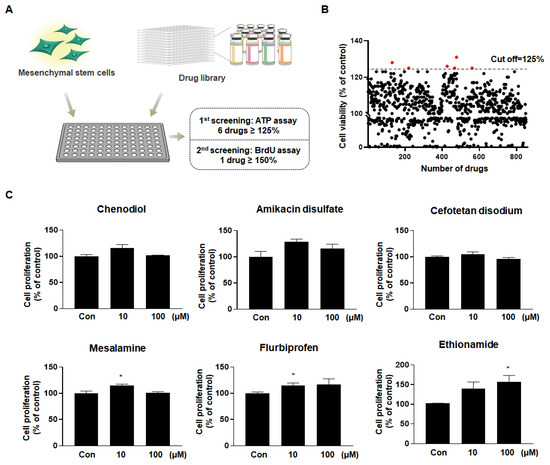 Figure 1. Ethionamide was selected to promote the proliferation of mesenchymal stem cells (MSCs). (A) Experimental design of drug library screening. MSCs were exposed to a drug library consisting of 850 FDA-approved compounds, and ethionamide was selected after two screenings. (B) MSCs were treated with 10 μM of drugs and the cell viability was measured by ATP assay. Six drugs were selected as a result of the first screening (cut off ≥125%). (C) Cell proliferation was measured by BrdU assay after treating MSCs with 10 μM and 100 μM of six drugs. The results obtained from three independent experiments were expressed as a percent of untreated control ± SEM; * p < 0.05 vs. untreated control.