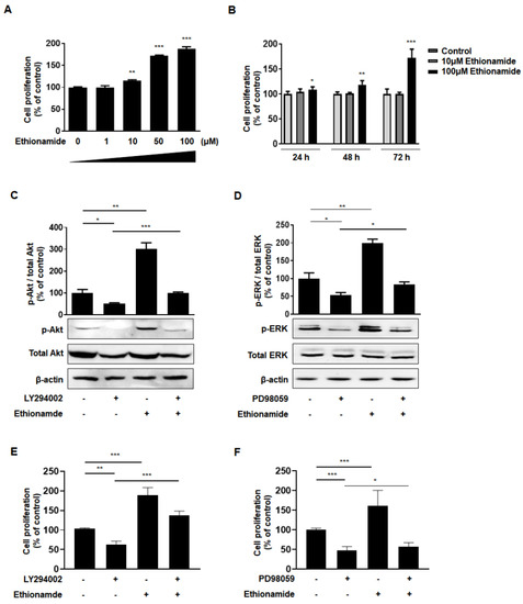 Figure 2. Ethionamide stimulated proliferation of MSCs via activating phosphatidylinositol 3-kinase (PI3K)/Akt and mitogen-activated protein kinase/extracellular signal-regulated protein kinase kinase (MEK/ERK1/2) signaling pathways. (A) MSCs were exposed to varying concentrations of ethionamide. The proliferation of MSCs was measured by BrdU ELISA after 72 h incubation. (B) The proliferation of MSCs was measured by BrdU ELISA after treatment with 10 μM and 100 μM of ethionamide for 24 h, 48 h, 72 h. (C) PI3K/Akt and (D) MEK/ERK1/2 signaling pathways were evaluated by Western blotting. The cells were treated with LY294002 (30 μM), the inhibitors of PI3K and PD98059 (50 μM), the inhibitors of MEK to suppress signaling pathways. β-actin was used as an internal control. (E,F) After the treatment of the cells with ethionamide and inhibitors, the proliferation of MSCs was measured by the BrdU ELISA. The results obtained from three independent experiments were expressed as a percent of untreated control ± SEM; * p < 0.05, ** p < 0.01 and *** p < 0.005 vs. untreated control.