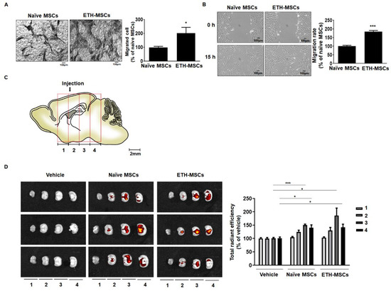 Figure 3. Ethionamide increased the migration ability of MSCs. The migration ability of MSCs was measured by the Boyden chamber assay and wound healing assay in vitro. (A) MSCs were cultured in transwell with 0.8 um pore size and after 24 h, migrated cells were stained with hematoxylin. (B) A representative image obtained after scratching the surface of 100% confluent MSCs and after 15 h, narrowed gap was measured using Image J. (C) The migration ability of MSCs was measured ex vivo. After injection, the mouse brain tissues were divided into four regions. (D) The maintenance of MSCs in each region was monitored by optical imaging. Results obtained from three independent experiments are expressed as percent of naïve MSCs or vehicle ± SEM; * p < 0.05 and *** p < 0.005 vs. naïve MSCs or vehicle control. Vehicle; the media used to resuspend the MSCs for injection. Scale bars = 100 μm.