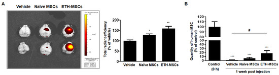 Figure 5. Preconditioning with ethionamide enhanced the survival of MSCs in vivo. The survival rate of MSCs was assessed. (A) MSCs were shown by red fluorescence signal of optical imaging ex vivo. (B) The quantification of survived MSCs was investigated by qPCR using human-specific Alu primer. Results obtained from three independent experiments are expressed as percentage of control ± SEM; * p < 0.05, ** p < 0.01, and *** p < 0.005 vs. control (0 h). Control (0 h); the brain tissue extracted immediately after MSCs injection. # p < 0.05 vs. vehicle. Vehicle; the media used to resuspend the MSCs for injection.