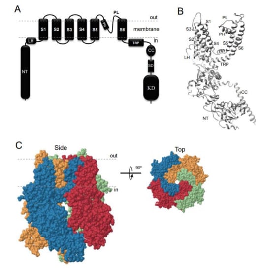 TRPM7 encodes a bi-functional protein comprising a TRP-type transmembrane channel unit fused to a C-terminal α-type serine/threonine-protein kinase domain [1,2,3]. Similarly to other TRP channels, the channel-coding segment of TRPM7 comprises six transmembrane helixes with a channel pore-forming sequence located between the fifth and six helices (Figure 1A,B). Four TRPM7 proteins assemble in a symmetric channel complex (Figure 1C) [1,2,3]. Hence, one TRPM7 channel moiety is linked to four cytosolic kinase domains. Among other known channels and kinases, only TRPM7 and its homologous protein TRPM6 are known as channels covalently fused to protein kinase domains [12,13,14,15]. The crystal structure of the C-terminal TRPM7 domain revealed the three-dimensional packing of the catalytic domain of the kinase [16]. More recently, cryo-electron microscopy of the truncated TRPM7 protein (lacking the kinase domain) clarified the role of distinct amino acid residues for the tetrameric assembly of the channel segment (Figure 1B,C) [17]. However, the positioning of the kinase and channel units relative to each other in the full-length TRPM7 protein, as well as distinct rearrangements in TRPM7 folding during channel gating, remain unknown [18].