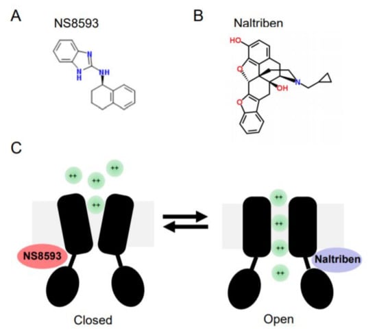 Chemical structures and mode of action of NS8593 and naltriben on the TRPM7 channel. (A) NS8593 chemical structure. (B) Naltriben chemical structure. (C)The TRPM7 channel is depicted in the closed and open states. NS8593 acts as negative gating modulator of the channel, whereas naltiben triggers opening of TRPM7 and influx of divalent cations (green balls) into the cell.