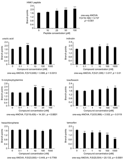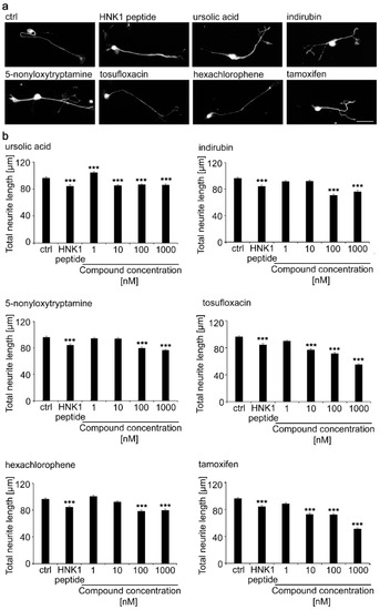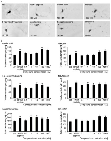 Neurite lengths were then determined for motor neurons maintained for 24 h after seeding in the presence of compounds in the range of concentrations between 0.1 and 1000 nM (Figure 2). Compared to the negative vehicle control, the HNK1 mimetic peptide increased neurite outgrowth by approximately 50%. For each of the 6 tested compounds, neurite lengths were slightly, although not statistically significantly longer than on the HNK1 peptide mimetic, most prominently between 100 and 1000 nM for ursolic acid, indirubin, and 5-nonyloxytryptamine. Tosufloxacin showed increased neurite length between 0.1 and 1000 nM. Hexachlorophene led to increased neurite length between 1 and 1000 nM, when compared to the negative control. The HNK1 peptide was used at a 100 µM concentration and the compounds were similarly effective at higher nM concentrations except for tosufloxacin, which was active at a concentration as low as 0.1 nM. It is noteworthy that the small compounds mimicking HNK1 trigger functions at nM concentrations, whereas the HNK1 mimetic peptide triggers neurite outgrowth at µM concentrations. A similar effect was observed with LewisX and polysialic acid mimetics [27,28]. A potential explanation could be that smaller molecules are more flexible in binding into the receptor-binding pocket compared to a larger peptide. In contrast, a peptide might bind with several binding sites into the receptor pocket compared to small organic compounds, which might occupy only one binding site in the receptor pocket. Thus, a higher concentration of small organic compounds is needed to inhibit the binding of a peptide to a receptor. Of note, we observed differences in neurite lengths in different experiments. Preparation of neurons, and in particular motor neurons, has been observed to be variable, often depending on the yearly season and even time of the day [29]. Therefore, standard controls have to be included in each experiment and used to assure the robustness of results. In this study we used the HNK1 peptide as a positive control and the vehicle solution as negative control. All experiments were carried out three times and on different days.