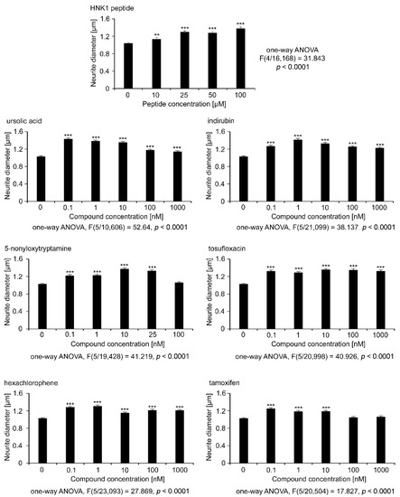 Measurements of neurite diameter were carried out by using the automated InCell microscope (GE Healthcare Life Sciences) and the InCell analysis software setting, which automatically calculate neurite diameter under the premise that neurite vitality is seen by its sturdy process (Figure 3). The average neurite diameter for the vehicle control was 1.03 µm. The HNK1 mimetic peptide increased the neurite diameter in a concentration-dependent manner, starting at 25 µM up to 100 µM with a maximum diameter of 1.37 µm (Figure 3). Interestingly, all mimetic compounds increased the neurite diameter of motor neurons in the broad concentration range of 0.1 nM to 1000 nM, except for 5-nonyloxytryptamine, which showed a similar neurite diameter as the control at 100 nM, and tamoxifen, which had similar values at 100 and 1000 nM concentrations, possibly reflecting a lower cell vitality, although this was not evident at this concentration for the capacity for neurite outgrowth, which was highest for all concentrations tested for this compound. The maximal neurite diameter of approximately 1.4 µm was found with treatments of ursolic acid at 0.1 nM, indirubin at 1 nM, and 5-nonyloxytryptamine at 10 nM.