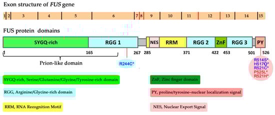 A schematic diagram of exon structure of the FUS gene and domain structure of the FUS protein [54]. * Mutations identified in patients with familial amyotrophic lateral sclerosis (fALS) and implicated in DNA repair and DDR [37,40].
