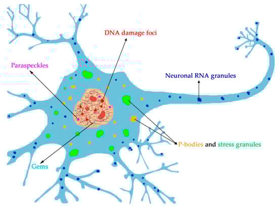 Notably, through its long N-terminal LCD with prion-like properties, higher-order multimolecular assembly of FUS either alone or in the presence of RNA gives rise to diverse structures including aggregates, hydrogels, amyloid fibrils and liquid droplets in vivo that have been the subject of intense research since pathological mutations in FUS were directly associated with two major neurodegenerative diseases, amyotrophic lateral sclerosis (ALS) and frontotemporal lobar degeneration (FTLD), and the identification of cytoplasmic inclusions of FUS in neurons of the affected patients [41,52,53,55,56,57]. In agreement with its ability to aggregate, among more than 200 yeast-prion-like proteins that have been identified in the human proteome [58], FUS has been ranked 15th for its prion-like properties and 1st among RBPs [59]. In particular, it has been shown that SYGQ- and glycine-rich regions at the N terminus of FUS have prion-like properties and accordingly play an important role in FUS aggregation. In line with this notion, a truncated FUS protein lacking the N terminus is not able to form droplets or aggregates both in vitro and in vivo [17,56,60,61,62,63,64]. Weak homotypic multivalent intermolecular interactions occur between N-terminal LCDs thereby resulting in FUS self-assembly into liquid-like dynamical compartments as a single component. Heterotypic interaction with other proteins and/or nucleic acids can lead to heterogeneous higher-order structures giving rise to higher complexity in terms of composition, shape and dynamics and most probably biological functions [52,55,64,65]. In this way, it has been suggested that phase transition, in particular liquid–liquid phase separation (LLPS) of protein or protein–nucleic acid mixtures underlies the emergence of membrane-less compartments such as nucleoli, Cajal bodies, gemini of Cajal bodies, Nuage bodies, speckles, paraspeckles, DNA damage foci, stress granules and P-bodies in the cell [28,29,30,66]. In the emerging field of phase separation biology, FUS has received even more attention since pathological mutations in the LCD that impair FUS were shown to trigger a phase transition from a reversible liquid-like droplet or gel-like state to irreversible solid-like states possibly promoting the formation of cytoplasmic inclusions of FUS found in ALS and FTLD [66]. Taking into account that FUS undergoes phase separation and interacts with other macromolecules such as RNA, DNA or PAR, FUS is regarded as an important player in the creation of membrane-less compartments in vivo under physiological and stressful conditions [67,68]. Indeed, nuclear FUS has been detected in association with DNA damage foci [17,37], paraspeckles [69] and SMN1 bodies (Gems) [70], whereas cytoplasmic FUS is recruited into stress granules or P-bodies [71,72,73,74,75,76,77,78,79,80] and neuronal RNA granules [81,82] (Figure 2).