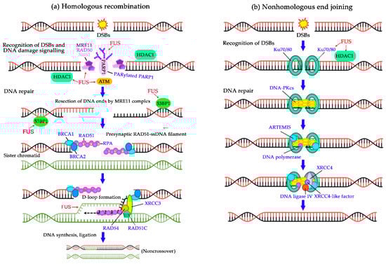 The involvement of FUS in double-strand DNA break (DSB) repair pathways. Schematic overview of HR, NHEJ illustrating basic steps of these pathways along with the proteins implicated in each step [86]. (a) The influence of FUS on HR. Simplified scheme for HR. The Mre11/Rad50/NBS1 complex starts resection on the DSBs to generate single stranded DNA. The ssDNA is first coated by Replication protein A (RPA), which is subsequently replaced by Rad51 with the help of BRCA1 and BRCA2. These Rad51 nucleoprotein filaments mediate strand invasion on the homologous template. The invading 3′-end of ssDNA serves as a primer for DNA synthesis. D-loop strands extended by DNA repair synthesis dissociate from their sister chromatid complements and reanneal with their original complementary strands. Additional DNA synthesis in the reannealed DNA duplex and ligation of the remaining single strand nicks complete the repair in the case of synthesis-dependent strand-annealing model of D-loop resolution, forming non-crossover products. FUS interacts with histone deacetylase 1 (HDAC1) and PARylated PARP1, binds to a D-loop intermediate and affects DSB-dependent accumulation of ATM (Ataxia-telangiectasia mutated serine-proteins kinase), NBS1 (Nijmegen breakage syndrome 1) and 53BP1 (p53-binding protein 1) [37,49]. (b) The effect of FUS on NHEJ. Simplified scheme for NHEJ. The two broken DNA ends are processed by the action of the end-binding Ku70/80 heterodimer complex, DNA-dependent protein kinase, catalytic subunits, (DNA-PKcs), artemis, DNA polymerase and ligated by DNA Ligase IV-XRCC4 complex. FUS interacts with HDAC1 and affects accumulation of Ku70/80 at DSBs [37].