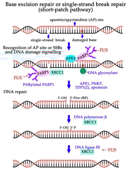 The involvement of FUS in base excision repair (BER) or single-strand break (SSB) repair pathways. Simplified scheme for BER/SSBR short-patch pathway [87]. Monofunctional DNA glycosylases catalyse the removal of the damaged base through cleavage of the C1’-N-glycosylic bond, leaving an AP site. AP endonuclease1 (APE1) cleaves AP site, DNA polymerase β inserts a single nucleotide and removes the 5′-deoxyribose phosphate (dRP), and the resulting nick is sealed by DNA ligase III-XRCC1 complex. In the case of SSB, the 5′-and 3′-termini containing blocking modifications can be converted to 5′-phosphate (P) and 3′-hydroxyl (OH) moieties by APE1, polynucleotide kinase 3’-phosphatase (PNKP), tyrosyl-DNA phosphodiesterase 1/2 (TDP1, TDP2) and/or aprataxin. AP sites, SSBs, arising endogenously or exogenously are bound by PARP1, which is then activated and autoPARylated. AutoPARylated PARP1 recruits repair proteins, in particular XRCC1 to the SSB [87]. The impact of FUS on BER is as follows: FUS interacts with PARylated PARP1 and the DNA ligase III–XRCC1 complex, thereby stimulating the ligation of DNA ends [40].