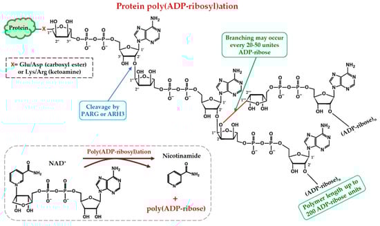 A diagram of the structure of PAR and protein PARylation. The scheme illustrates chemical structure of NAD+ and a chain of ADP-ribose units linked by the α(2′-1′′) O-glycosidic bond between ribose residues (linear chain) and by the α(2′′-1′′′) glycosidic bond between two nicotinamide-proximal ribose residues (branching). PARG and ARH3 is the main enzymes that degrade PAR and possesses exo- and endoglycosidase activities hydrolysing the glycosidic bonds between ribose units of PAR [98,99].