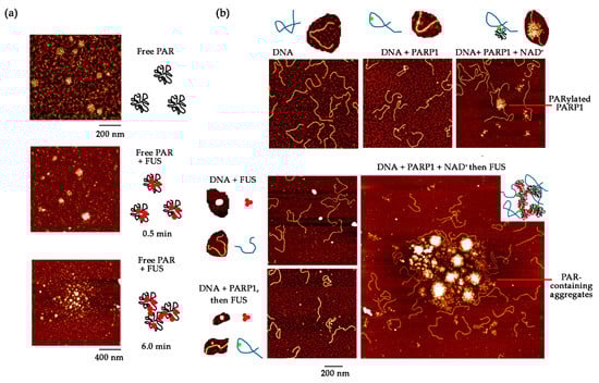 The formation of large DNA-rich assemblies in the presence of FUS after PAR synthesis by PARP1 [101]. (a) Representative AFM images of PAR:FUS complexes at different incubation times. PAR: 1 µM; FUS: 40 nM. (b) Representative AFM images of 1200-bp nicked DNA (1.25 nM) after incubation with PARP1 (3 nM) for 5 min in the presence or absence of NAD+ (0.3 mM) followed by the addition of FUS (40 nM) and incubation for 1 min.