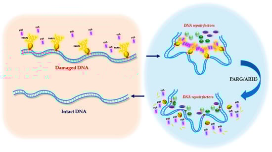 - Davidovic, L.; Vodenicharov, M.; Affar, E.B.; Poirier, G.G. Importance of poly(ADP-ribose) glycohydrolase in the control of poly(ADP-ribose) metabolism. Exp. Cell Res. 2001, 268, 7–13. [Google Scholar] [CrossRef]