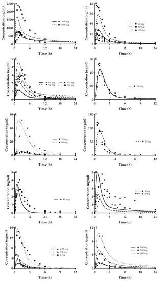- Perdaems, N.; Blasco, H.; Vinson, C.; Chenel, M.; Whalley, S.; Cazade, F.; Bouzom, F. Predictions of metabolic drug-drug interactions using physiologically based modelling: Two cytochrome P450 3A4 substrates coadministered with ketoconazole or verapamil. Clin. Pharm. 2010, 49, 239–258. [Google Scholar] [CrossRef]