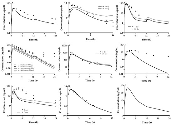 Predicted plasma concentrations (line) of the victim drugs agents using the PBPK model and observed plasma concentrations (points) following oral administration to subjects when co-administered with CsA (twice daily). (A) atorvastatin; (B) cerivastatin; (C) pravastatin; (D) rosuvastatin; (E) fluvastatin; (F) simvastatin; (G) lovastatin; (H) repaglinide; (I) bosentan. Observed data were cited from clinic reports [14,15,16,17,18,19,20,21,23,24,92,93,94,95,96].