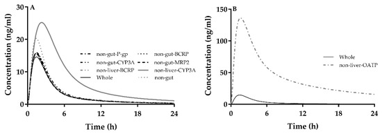Effects of (A) hepatic CYP3A4 (non-liver CYP3A4), hepatic BCRP (non-liver BCRP), intestinal CYP3A4 (non-gut CYP3A4), intestinal P-gp (non-gut P-gp), intestinal BCRP (non-gut-BCRP), intestinal MRP2 (non-gut-MRP2) and integrated effects of the intestine (intestinal CYP3A4, intestinal P-gp, intestinal MRP2 and intestinal BCRP, non-gut) to plasma concentrations of atorvastatin following oral 40 mg of atorvastatin, which was compared with actual concentrations (Whole), (B) hepatic OATPs (non-liver-OATP).