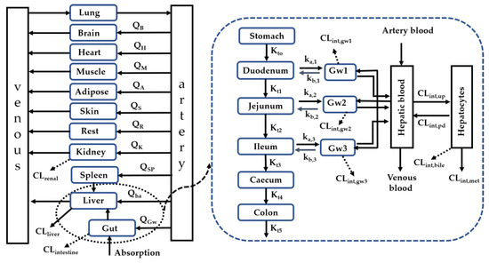 A whole-body PBPK model characterizing the interplay of enzymes and transporters in the intestine, liver and kidney (Figure 5) was developed to predict pharmacokinetic behaviors of victim drugs and CsA as well as DDIs of CsA with victim drugs. The PBPK model consisted of the lung, heart, brain, muscle, kidney skin, spleen, adipose tissues, other body tissues, gastrointestinal systems and liver [26,50,102].