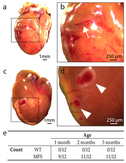 Macroscopic analysis of the heart of MFS mice. (a,b): macroscopic view of the heart of a MFS mouse presenting a tear at the level of the right ventricular wall. The tear is indicated with a white arrow in panel (b). (c,d): macroscopic view of the heart of a MFS mouse presenting vesicles at the level of the right ventricular wall. Vesicles are indicated with a white arrowhead in panel (d). (e): number of WT and MFS mice presenting cardiac lesions per age group. Scale bar of panels (a,c) = 1 mm, scale bar of panels (b,d) = 250 µm.