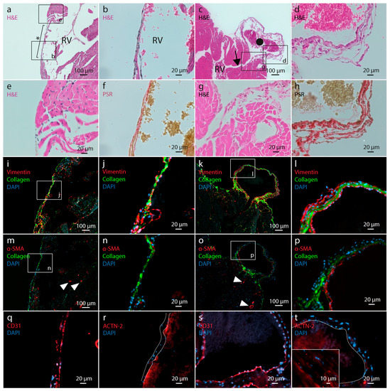 In order to identify the nature of the lesions in the RV free wall, histological staining was performed on consecutive myocardial tissue sections in which a tear or vesicle was present (Figure 3). Standard HE staining revealed that both the tear as well as the outer wall of the vesicle (Figure 3a–d) are composed of a relatively thin layer of epicardial cells embedded in ECM components. The tear consists of a thinned region in the RV wall lacking cardiac muscle tissue adjacent to the epicardial layer. The vesicle-like lesions are connected with the lumen of the RV through a small duct between cardiac muscle lamellae (Figure 3c). Furthermore, in-depth cellular morphology analysis of the HE-stained tissue sections did not show any evidence of inflammatory cell infiltration at the site of or near the myocardial wall lesions (Figure 3b,d,e,g). Picrosirius red (PSR) staining (Figure 3f,h), as well as a fluorescent dye (Figure 3i–p), showed that both the tear and the vesicle wall contain abundant levels of collagen. The cellular border of these cardiac lesions consists mainly of fibroblasts, as indicated by a positive vimentin staining (Figure 3i–l), with an inner lining consisting of CD31-positive endothelial cells (Figure 3q,s). Adjacent to the myocardial tear, a discrete number of cells stained positive for the myofibroblast marker α-smooth muscle actin (α-SMA, ACTA2) (Figure 3n). Relative to the tear, the number of myofibroblasts is higher in the wall of the vesicle (Figure 3o,p), where a layer of subendothelial cells was shown to express α-SMA. No cardiac myocytes were located in the tear nor the vesicle wall, as evidenced by the absence of α-actinin-2 (ACTN-2) staining (Figure 3r,t, respectively).