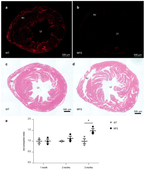 Micrographs of cross-sectioned myocardial tissue stained for fibrillin-1 showed an almost complete loss of fibrillin-1 staining in the sections of MFS mice (Figure 4a,b). Fibrillin-1 staining was abundantly present in the myocardial tissue sections of WT mice located between the muscle lamellae of the trabeculated myocardium and at the level of the subepicardial region, with strong fibrillin-1 staining along the RV free wall. In contrast, very limited fibrillin-1 staining was observed throughout the myocardial tissue section of the MFS mice. Analysis of HE-stained cardiac sections showed a prominent decrease in compaction of the ventricular myocardial tissue, demonstrated by more free space between the cardiac muscle lamellae (representative images in Figure 4c,d). The calculated index for cardiac non-compaction increased with age in MFS mice and was significantly higher compared to WT littermates at the age of 3 months (Figure 4e).