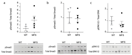 Western-blot analysis was performed on LV myocardial tissue samples of 3-month-old WT and MFS mice in order to investigate the contribution of canonical (Smad2/3) and noncanonical (ERK1/2) TGFβ-dependent signaling in the myocardium. The ratio of phosphorylated Smad2, Smad3, and ERK to total respective proteins was calculated to document the activation of the specific pathway. Compared to WT littermates, the MFS mice did not show a significant difference in either Smad2, Smad3, or ERK activation (Mann–Whitney U-test; p ≥ 0.1111, Figure 5).