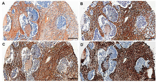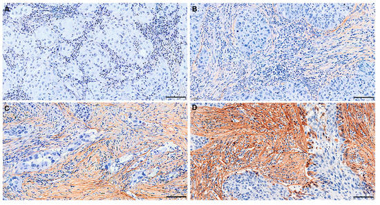Representative immunohistochemical images with stromal periostin (POSTN) expression in non-small cell lung carcinoma (NSCLC), scored as (A) 0—no reaction, (B) 1—weak expression, (C) 2—moderate expression, and (D) 3—strong expression. Magnification 200×. Bar = 100 µm.