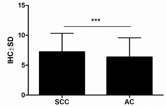POSTN stromal cell expression was noted in 695 out of 700 (99.3%) NSCLC samples. The mean value of POSTN expression was 6.80 ± 2.50. Based on statistical analysis, sections scored 0–7 points were regarded as “low”, whereas sections scored 8–12 points were regarded as “high”. High POSTN expression in CAFs cells was noted in 334 (47.7%) of the analysed NSCLC cases, whereas low POSTN expression in stromal cells (CAFs) was detected in 366 (52.3%) of the NSCLC cases. Furthermore, POSTN expression in stromal cells was significantly higher in the SCC (7.22 ± 3.11) compared to the AC subtype (6.34 ± 3.24) (Figure 2).