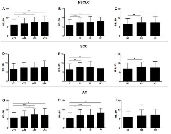 Expression level of periostin (POSTN) with regard to the clinicopathological factors of patients. Comparison of immunohistochemical periostin (POSTN) expression in the stromal cells (CAFs) of the non-small cell lung carcinoma (NSCLC), squamous cell cancer (SCC), and adenocarcinoma (AC) subtypes, (A,D,G, respectively) according to the tumour size (* p < 0.05, ** p < 0.005, *** p < 0.001), (B,E,H) clinical cancer stage (* p < 0.05, ** p < 0.005, *** p < 0.001, **** p < 0.0001), and (C,F,I) lymph node status (* p < 0.05, ** p < 0.005); Mann–Whitney U test.