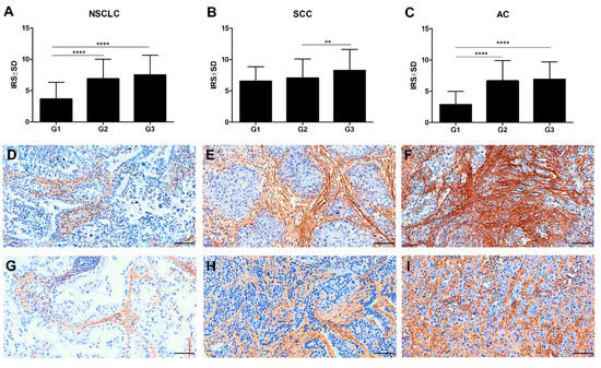 Comparison of periostin (POSTN) expression levels in different grades of malignancy (G) of the tumour in (A) non-small cell lung carcinoma (NSCLC) (**** p < 0.0001), (B) squamous cell cancer (SCC) (** p < 0.005), and (C) adenocarcinoma (AC) (**** p < 0.0001); Mann–Whitney U test. Immunohistochemical expression of periostin (POSTN) in stromal cells increased with a higher malignancy grade (G) in squamous cell cancer (SCC): G1 (D), G2 (E), G3 (F), and in adenocarcinoma (AC): G1 (G), G2 (H), and G3 (I). Magnification 200×. Bar = 100 µm.