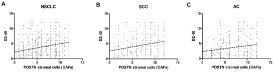 We also noticed a weakly positive correlation of POSTN expression by CAFs with D2-40 in stromal cells in the whole cohort of patients as well as in the SCC and AC subtypes (r = 0.27, *** p < 0.001, r = 0.25, *** p < 0.001, r = 0.2, *** p < 0.001, respectively) (Figure 7A–C).