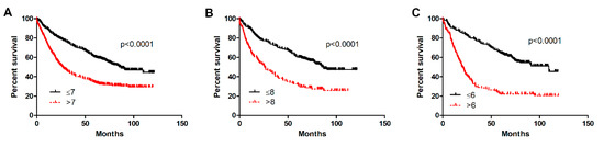 The prognostic impact of POSTN expression in NSCLC was analysed with respect to the overall survival (OS) of patients independently in the whole study cohort as well as in AC and SCC. The log-rank (Mantel–Cox) analysis showed that a higher expression of POSTN in CAFs in NSCLC was related to OS. Patients with high POSTN expression in CAFs had a significantly shorter survival compared to the group with low expression in the whole study group (**** p < 0.0001), as well as in the two particular histological subtypes, i.e., AC and SCC (**** p < 0.0001, **** p < 0.0001, respectively), (Figure 8A–C).