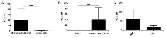 Significantly higher mRNA expression of POSTN was observed in the microdissected stromal cells (CAFs) compared to lung cancer cells (**** p < 0.0001, Mann–Whitney U test) (Figure 10A). Additionally, in the material from LCM, a significant difference in POSTN mRNA level was noted between the CAF cells and the microdissected non-malignant lung cells (NMLC), (*** p < 0.001, Mann–Whitney U test), (Figure 10B). POSTN mRNA expression in CAFs was also higher in the SCC subgroup compared to the AC cases (Figure 10C).