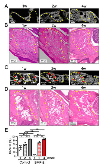 Transplantation of Bone Morphogenetic Protein (BMP)-2/beta-tricalcium phosphate (β-TCP) does not accelerate bone regeneration in the tooth extraction socket during the normal socket healing process. (A) Sagittal images of micro computed tomography micro-CT and (B) Hematoxyline and Eosin (HE)-stained sections after 1, 2 and 4 weeks of tooth extraction without any treatment. (C) Sagittal images of micro-CT and (D) HE-stained sections after 1, 2 and 4 weeks of BMP-2/β-TCP transplantation into the tooth extraction socket of the maxillary first molar. (E) The graph shows the quantitative analysis of the bone-fill rate in the tooth extraction socket. Bars represent the mean values and standard deviation (+/− SD) (n = 3–6). (* p < 0.05, ** p < 0.01, *** p < 0.001, ns: no significant difference. Two-way ANOVA/Tukey). Red arrowheads indicate the residual β-TCP. Yellow dashed lines indicate the tooth extraction socket.