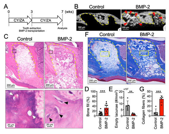 Transplantation of BMP-2/β-TCP partially induced bone formation in tooth extraction socket in a medication-related osteonecrosis of the jaw (MRONJ) prevention model. (A) Experimental design. BMP-2/β-TCP was transplanted into the extraction socket of the maxillary first molar after 3 weeks of CY/ZA administration in mice. CY/ZA administration was performed throughout the study period. ZA: zoledronate, CY: cyclophosphamide. (B) Sagittal images of micro-CT and (C) HE-stained sections, 4 weeks after transplantation. Lower panels are high magnification images of the squares in the upper HE-stained images. (D) The bone-fill rate in the tooth extraction socket and (E) the number of empty lacunae in the regenerated bone are shown in graphs, respectively. Bars represent the mean values and standard deviation (+/− SD) (n = 5–13). (** p < 0.01, *** p < 0.001. Student’s t-test). (F) Sagittal view of the tooth extraction socket stained with Masson’s trichrome, 4 weeks after transplantation. Yellow boxes indicate the total measured area for calculation of the ratio between the collagen fiber area and the total measured area. (G) The percentage area of the collagen fibers in the center of the tooth extraction socket is shown in the graph. Bars represent the mean values and standard deviation (+/− SD) (n = 5). (*** p < 0.001. Student’s t-test). Red arrowheads indicate the residual β-TCP. Black and white arrowheads indicate the osteocytes and empty lacunae, respectively. Yellow dashed lines indicate the tooth extraction socket.