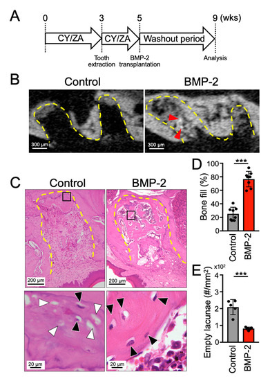 To evaluate the bone formation ability of BMP-2/β-TCP, CY and ZA, which had been administered to induce the MRONJ-like lesion for a total of 5 weeks, were withdrawn after BMP-2/β-TCP transplantation into the curetted tooth extraction socket on week 5. Four weeks after BMP-2/β-TCP transplantation, micro-CT and histological analyses showed that, in the BMP-2/β-TCP transplanted group, the tooth extraction socket was almost completely filled with new bone, and the average bone-fill rate was 76.5% ± 11.5% (Figure 3B–D), which was close to that observed during normal healing of the tooth extraction socket (Figure 1E). In contrast, in the control group, most of the tooth extraction socket was filled with soft tissue and the average bone-fill rate was 25.2% ± 9.7% (Figure 3B–D). Note that the number of empty lacunae was significantly lower in the BMP-2/β-TCP transplanted group (Figure 3E).