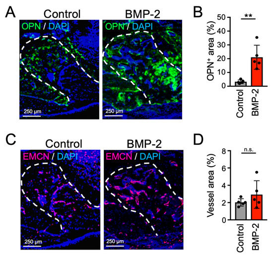 Next, immunohistochemical analysis was performed for identification of the expression of osteopontin (OPN), a non-collagen protein secreted by osteoblasts, in the tooth extraction socket. The results showed that the area positive for OPN was markedly larger in the BMP-2/β-TCP transplantation group, compared with the control group (Figure 4A,B). Moreover, tartrate-resistant acid phosphatase (TRAP)-positive osteoclasts were also observed on the surface of the regenerated bone in the tooth extraction sockets in both the BMP-2/β-TCP transplantation and control groups, indicating a physiological bone turn-over (Supplementary Figure S1). Furthermore, the expression of endomucin (EMCN), which is one of the vascular endothelial cell markers, was also analyzed. The results, however, revealed no significant difference in the positive area (percentage) of EMCN in the tooth extraction sockets between control and BMP-2/β-TCP-transplanted groups (Figure 4C,D).