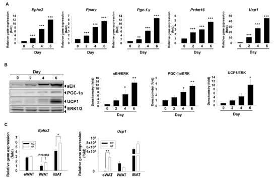 First, sEH mRNA and protein expression were examined during murine brown adipogenesis in vitro. mRNA expression of sEH encoding Ephx2 was time-dependently increased, along with brown marker peroxisome proliferator-activated receptor gamma (Pparγ), peroxisome proliferator-activated receptor gamma coactivator 1-alpha (Pgc-1α), PR domain containing 16 (Prdm16), and Ucp1 during differentiation (Figure 1A). Consistently, sEH protein expression was also time-dependently increased, along with PGC-1α and UCP1 protein expression during the process (Figure 1B).