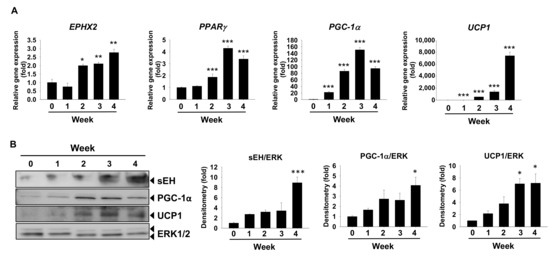 sEH mRNA and protein expression are increased during human brown adipogenesis in vitro. (A,B) Human brown preadipocytes were induced to differentiate for four weeks. Total RNA samples were collected at the start and the end of week 1, 2, 3, and 4 of the differentiation. (A) Relative mRNA levels of brown marker gene PPARγ, PGC-1α, UCP1, and EPHX2. mRNA expression was quantified relatively to the loading control 36B4 (B) Protein expression of sEH, PGC-1A, UCP1, and the loading control ERK1/2. Bar graphs show normalized densitometry for sEH/ERK1/2, PGC-1α/ERK1/2, and UCP1/ERK1/2. Data = Mean + SEM (n = 3). *, **, ***, p < 0.05, p < 0.01, and p < 0.001 compared to the week 0 sample, respectively.